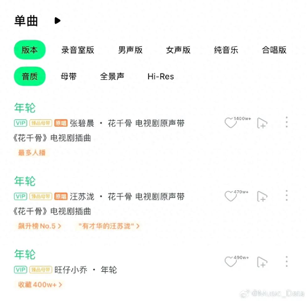 一個網紅,直接把兩個明星的粉絲搞起了對立。《年輪》這首花千骨的主題曲,在音樂平臺為雙原唱版本。這次汪蘇瀧方收回授權。而張碧晨也發文告別年輪,這也就意味著,若未獲得汪蘇瀧方的授權,她將不再擁有《年輪》的演唱權。 ?