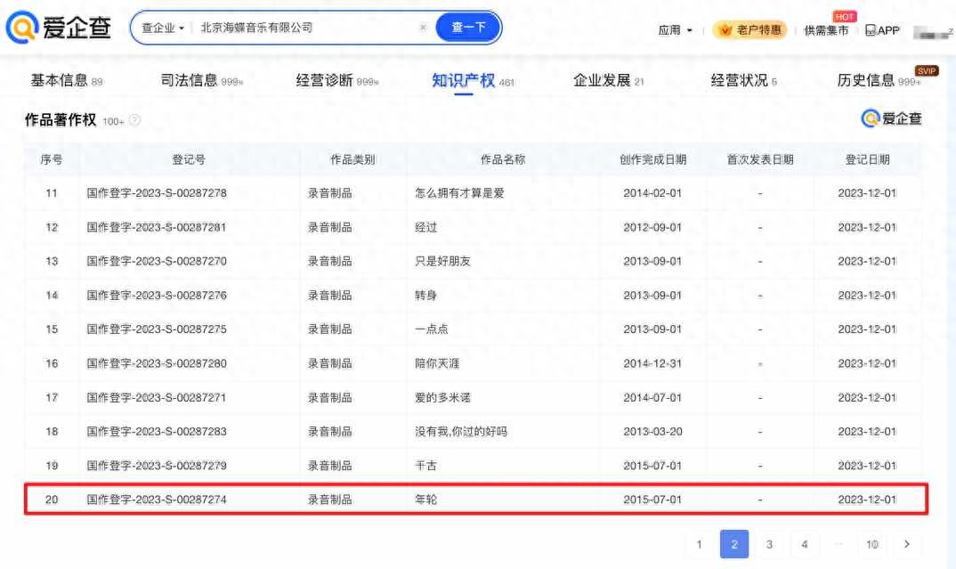 愛企查App顯示,2023年,北京海蝶音樂有限公司曾登記“年輪”作品著作權,作品類別為錄音制品。