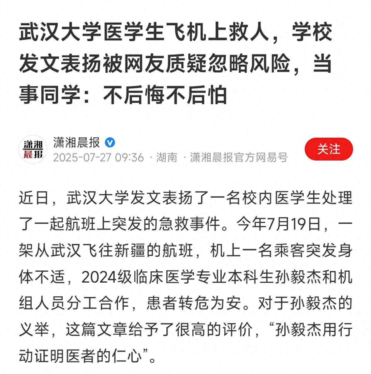 先別急著站隊(duì),把事兒捋一遍。7月19號(hào),武漢飛新疆的航班上,廣播突然喊“有沒有醫(yī)生”。武漢大學(xué)臨床醫(yī)學(xué)大二學(xué)生孫毅杰聽到后,沒多想就過去了。乘客是個(gè)二十來(lái)歲的姑娘,說頭暈、手腳發(fā)麻,之前坐飛機(jī)也犯過,那次還逼得飛機(jī)備降。
