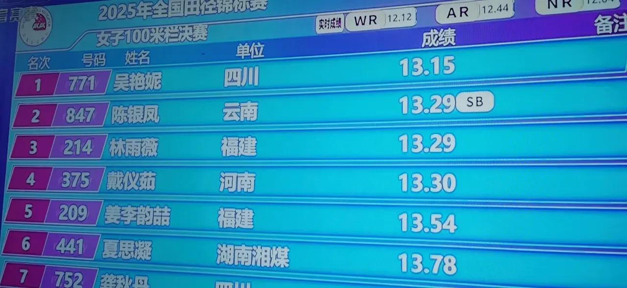 這場(chǎng)百米欄決賽根本沒人想到會(huì)這么慘烈。劉景揚(yáng)預(yù)賽飆到13秒03所有人都以為黑馬要?dú)⒊鼋Y(jié)果決賽摔了。戴儀儀茹拼到13秒22林雨薇靠千分位險(xiǎn)拿銅牌。吳艷妮13秒15奪冠成績一出來評(píng)論區(qū)炸了。有人說她實(shí)力不行靠運(yùn)氣有人說她裝清高。