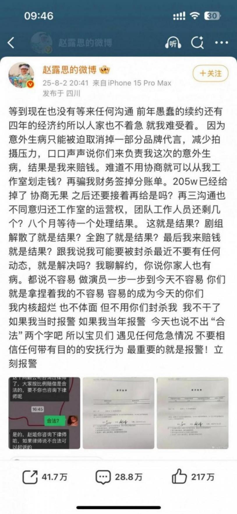 此外趙露思控訴經紀公司銀河酷娛未經協商劃扣工作室205萬,威脅"可能被封殺"等行為。并曬出重度焦慮報告,并宣布"不干了"。目前雙方陷入拉鋸戰。