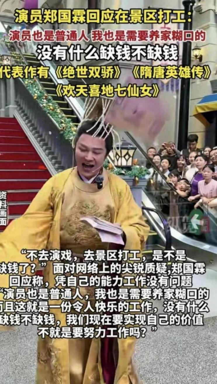 近有段視頻挺火的,49歲的演員鄭國霖在上海一個景區里穿起龍袍當起了NPC,重現他在《隋唐英雄傳》里演過的“李世民”,和游客玩得不亦樂乎,視頻在網上傳開后,不少網友都挺好奇:“現在明星也到景區打工了?”鄭國霖回應得特別實在,他說演員也是普通人,一樣得賺錢養家糊口,而且這份工作讓他挺開心,沒啥不好意思說的。