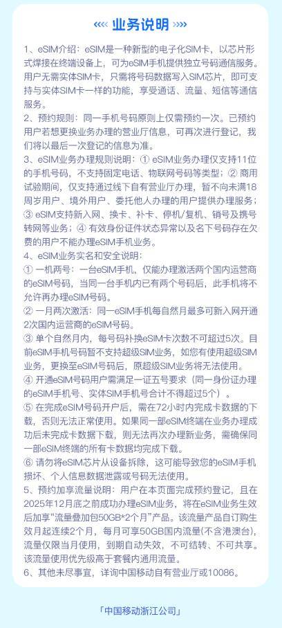預約詳情頁面也給出了eSIM的安全說明,在完成eSIM號碼開戶后,需在72小時內完成卡數據的下載,否則無法正常使用。如果同一部eSIM終端在業務辦理成功后未完成卡數據下載,則無法再次辦理新業務,需確保同一部eSIM終端的所有卡數據均完成下載。與此同時,請勿將eSIM芯片從設備拆除,這可能導致您的eSlM手機損壞、個人信息數據泄露或號碼無法使用。