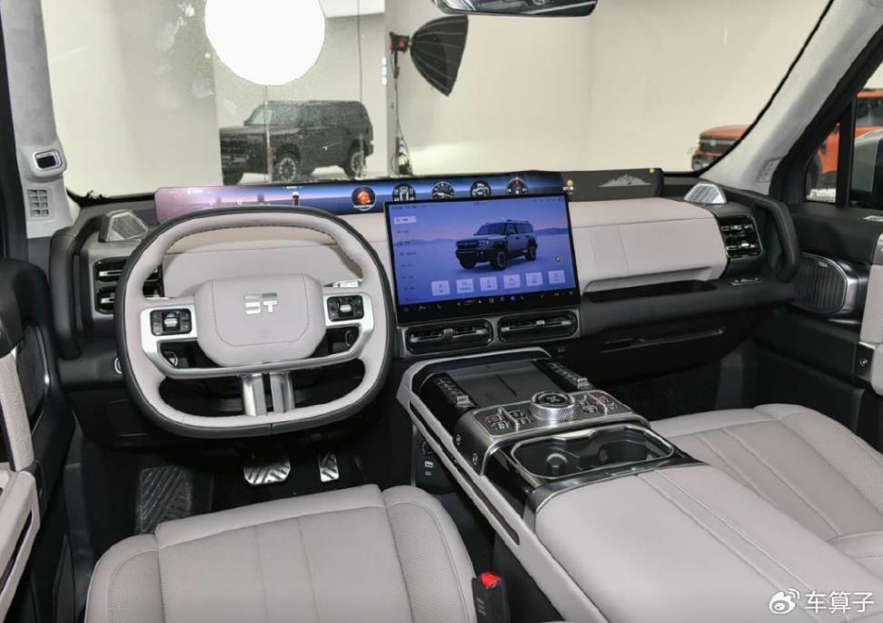 內(nèi)飾打破硬派車型的粗獷印象:6座版配備Nappa真皮座椅,一二排標(biāo)配通風(fēng)、加熱及八點(diǎn)按摩功能,副駕與二排右側(cè)的190mm長腿托提升舒適性。四屏聯(lián)動系統(tǒng)包含35.4英寸山脈天際屏和17.3英寸后排影院大屏,操作流暢度媲美高端家用車。細(xì)節(jié)上,防水防污的仿麂皮材質(zhì)、帶驅(qū)蚊功能的香薰系統(tǒng),兼顧越野場景與日常使用。不過6座版第三排因油箱侵占空間,垂直高度不足,更適合應(yīng)急使用。