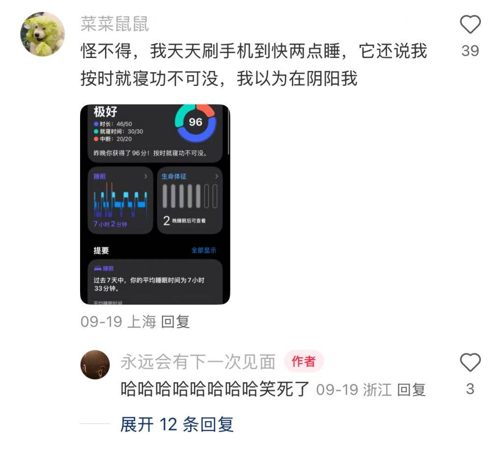 現(xiàn)在問AppleWatch用戶昨晚睡得怎么樣,人家不會只說“還行”或“不好”,大概率直接甩張手機(jī)截圖給你上面明明白白寫著“睡眠質(zhì)量100分”。