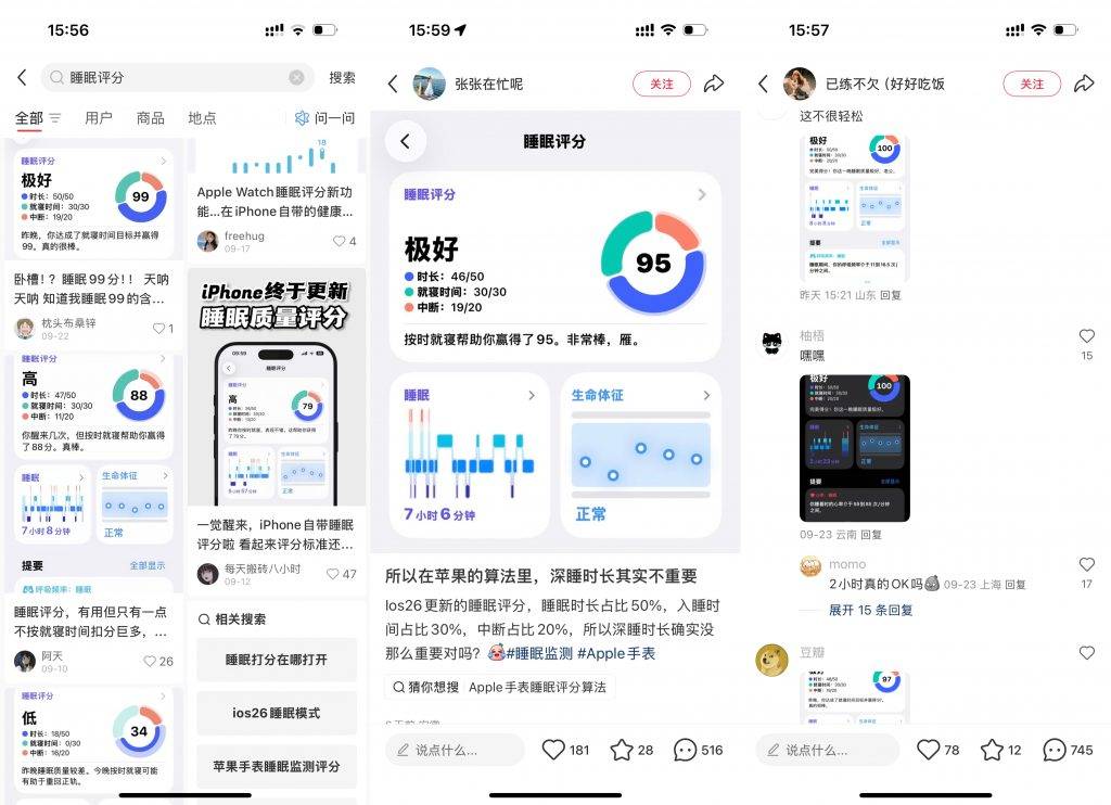 這功能一普及,小紅書上直接炸了鍋,搜“AppleWatch睡眠評分”,首頁全是曬截圖的帖子,首圖清一色是iPhone的評分界面,點(diǎn)進(jìn)評論區(qū)更熱鬧,大家互相曬自己的分?jǐn)?shù),有人曬100分求夸,有人曬二三十分求安慰。