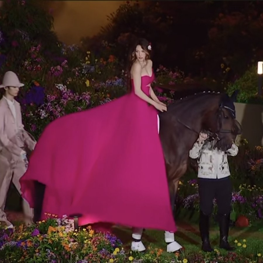 VOGUE晚會上,穿著粉色長裙的谷愛凌騎著馬緩緩走向主會場,自信大方,從容不迫。