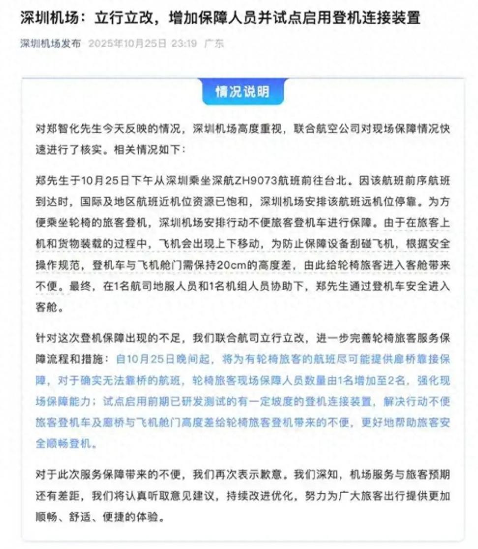 事件發酵后,深圳機場官方微博于當日傍晚發布聲明,向鄭智化致歉,并表示已啟動核查。25日深夜11時許,深圳機場微信公號發文表示,機場聯合航司立行立改,進一步完善輪椅旅客服務保障流程和措施:自10月25日晚間起,將為有輪椅旅客的航班盡可能提供廊橋靠接保障,對于確實無法靠橋的航班,輪椅旅客現場保障人員數量由1名增加至2名,強化現場保障能力。