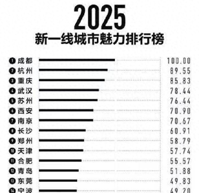 將目光集中在幾個比較受關注的城市上,杭州排在第二位,非常亮眼,它是浙江省的省會,副省級市,國務院批復定位是浙江經濟文化科教中心。長三角的重要城市之一,區域影響力很大,面積接近16850平方公里,常住人口大約1237.6萬,2024年地區生產總值達到21860億元,比去年增長了4.7%,這些數據說明它有體量也有活力,旅游景點眾多,物產豐富,交通便捷,人才和企業很多,把這些因素放在一起看,杭州能排到新一線名單前面去,人均創造出來的財富也是比較高水平。