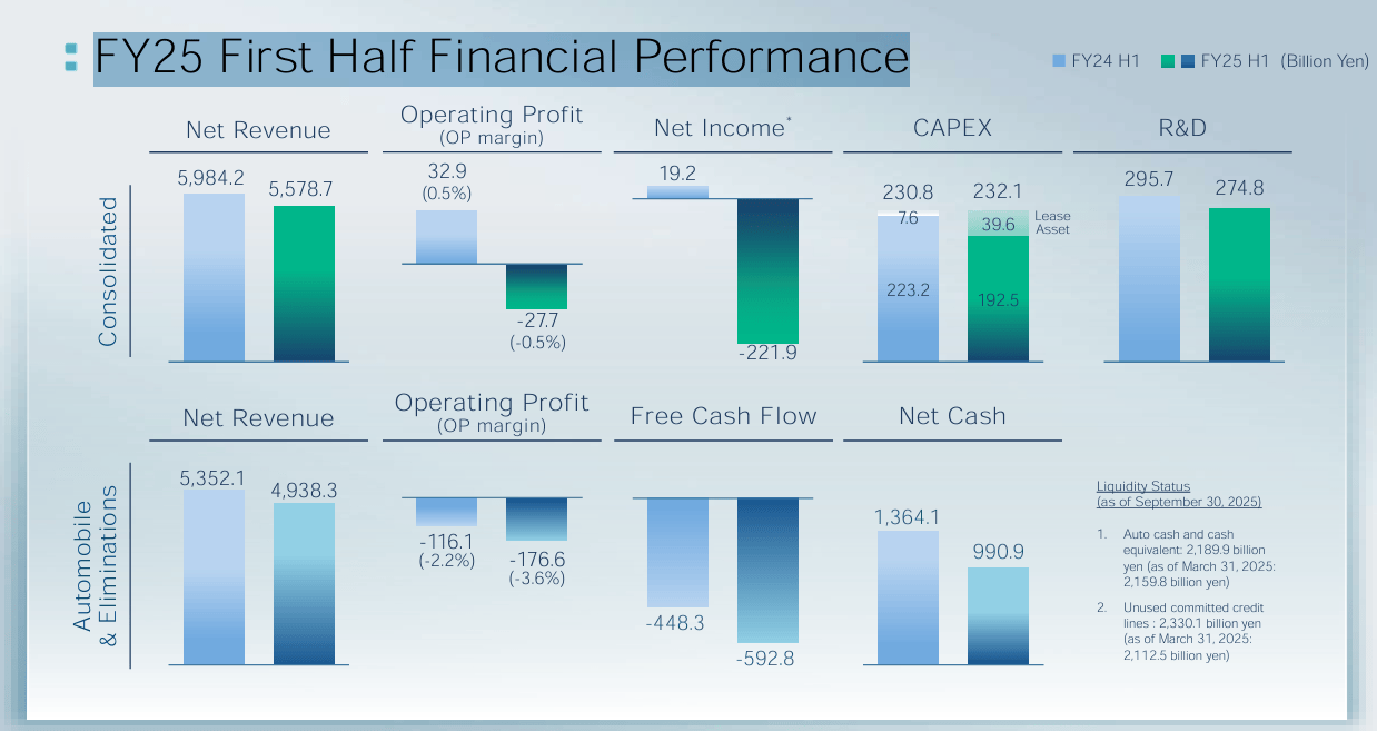 日產汽車公司發布的2025財年半年報(4月至9月)顯示,該公司當期凈虧損達2219.21億日元,去年同期則為盈利192.23億日元,業績由盈轉虧。