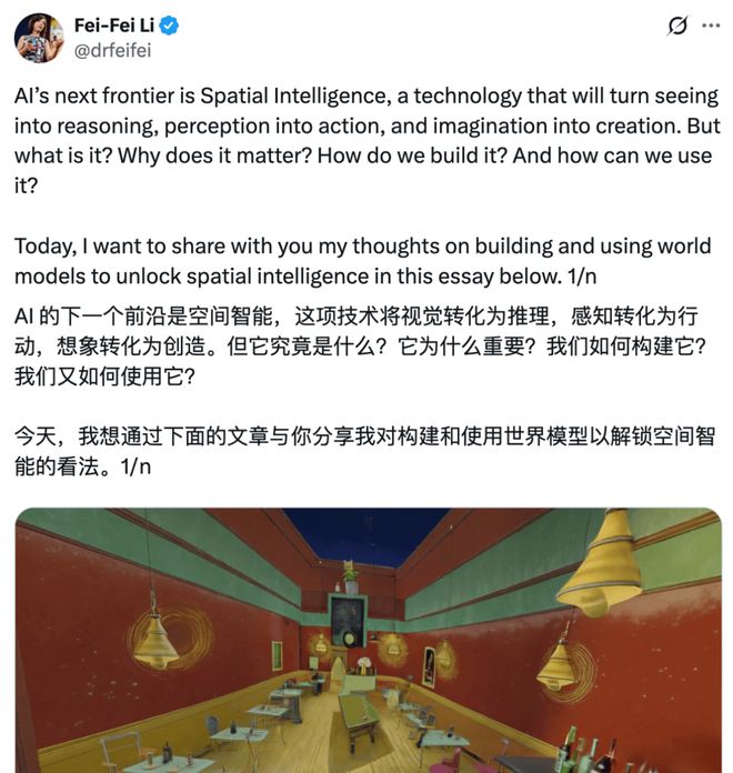 在昨晚,關(guān)于其投身的空間智能,斯坦福大學(xué)教授李飛飛發(fā)表了一篇長(zhǎng)篇博客《From Words to Worlds: Spatial Intelligence is AI’s Next Frontier》。