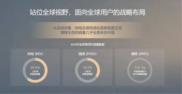 而最關鍵的,則是上面這張圖。雖然在中國,增程是主流的技術路線之一。但放在全球來看,增程的占比卻微乎其微。在新能源這個市場上,純電占比是 60.9%,插混是 34.6%。