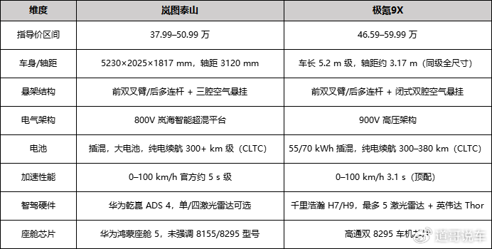 對(duì)比一下參照系:理想L9指導(dǎo)價(jià)40.98–43.98萬(wàn),問(wèn)界M9 2025款46.98–56.98萬(wàn)。結(jié)論很清晰:嵐圖泰山在價(jià)格上是向下“偷襲”理想L9。極氪9X則是往上硬剛問(wèn)界M9。